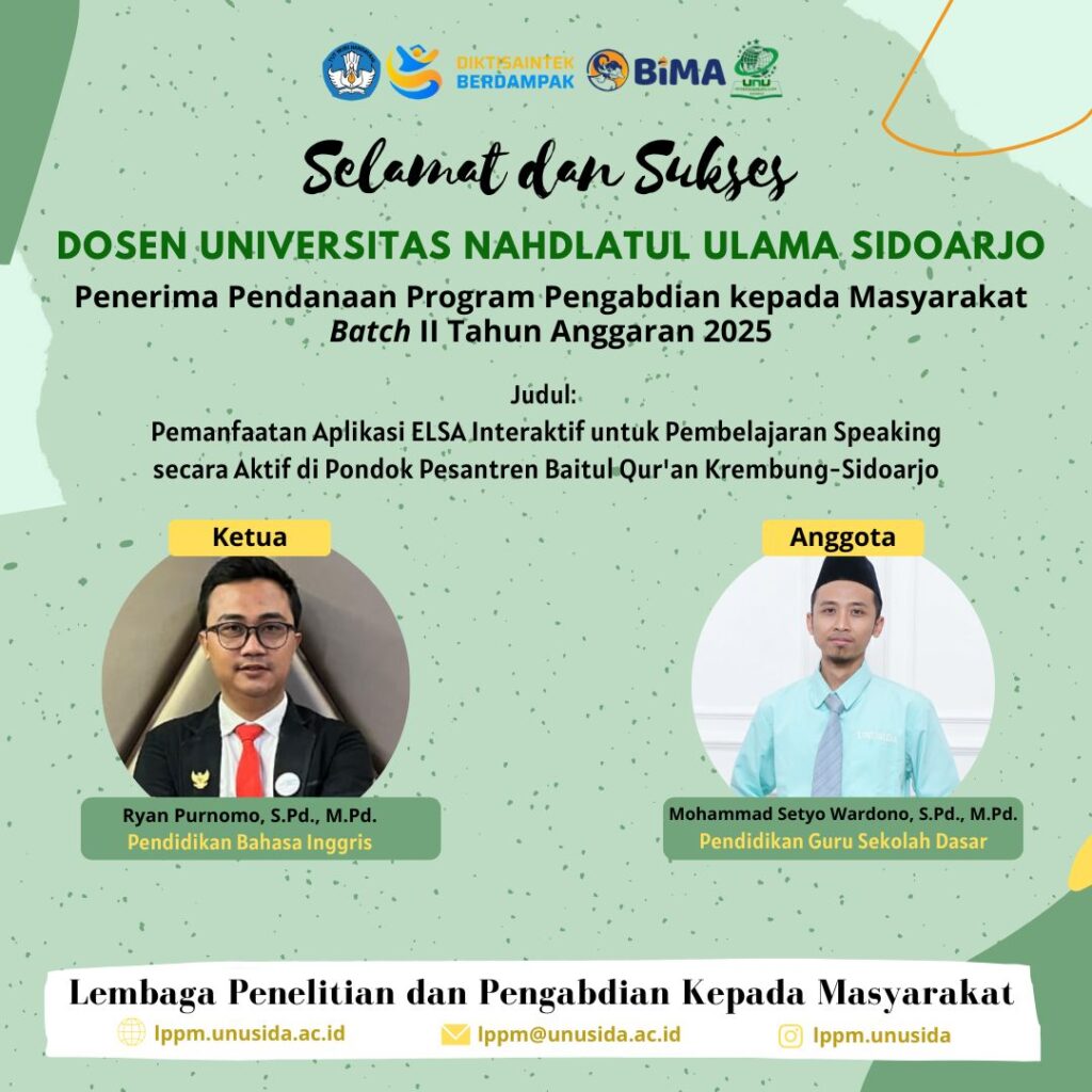 Sidoarjo – Universitas Nahdlatul Ulama Sidoarjo (UNUSIDA) kembali mencatatkan prestasi membanggakan. Dua dosen dari Program Studi Pendidikan Bahasa Inggris dan Pendidikan Guru Sekolah Dasar (PGSD) berhasil lolos sebagai penerima pendanaan Program Pengabdian kepada Masyarakat Batch II Tahun Anggaran 2025 dari Direktorat Jenderal Riset dan Pengembangan, Kementerian Pendidikan Tinggi, Sains, dan Teknologi (Kemendiktisaintek).